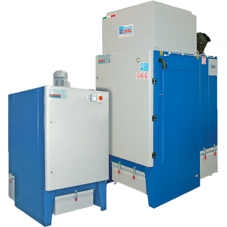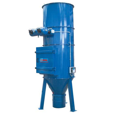 Purifying filter for wood dusts and shavings with automatic cleaning in backwash mode. Operating principle The CORAL AIRCOMPACT mod. cartridge filter with backwash cleaning is made up from, cartridge filtering elements enclosed in an air-tight central body and is designed to be used in vacuum plants. The dusty air enters from the connection in the lower part of the hopper and, due to the effect of a sudden decrease in speed, the larger particles settle and end up in the relative collection bin. The smallest or lightest particles re-ascend the body, inside which the filtering cartridges are housed; the polluted air runs through the cartridges from the outside inwards, in a way that the dust deposits externally while the air moves along the cartridge and escapes purified.