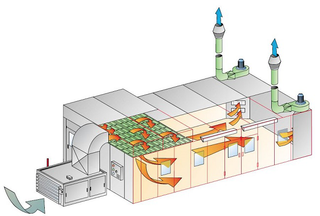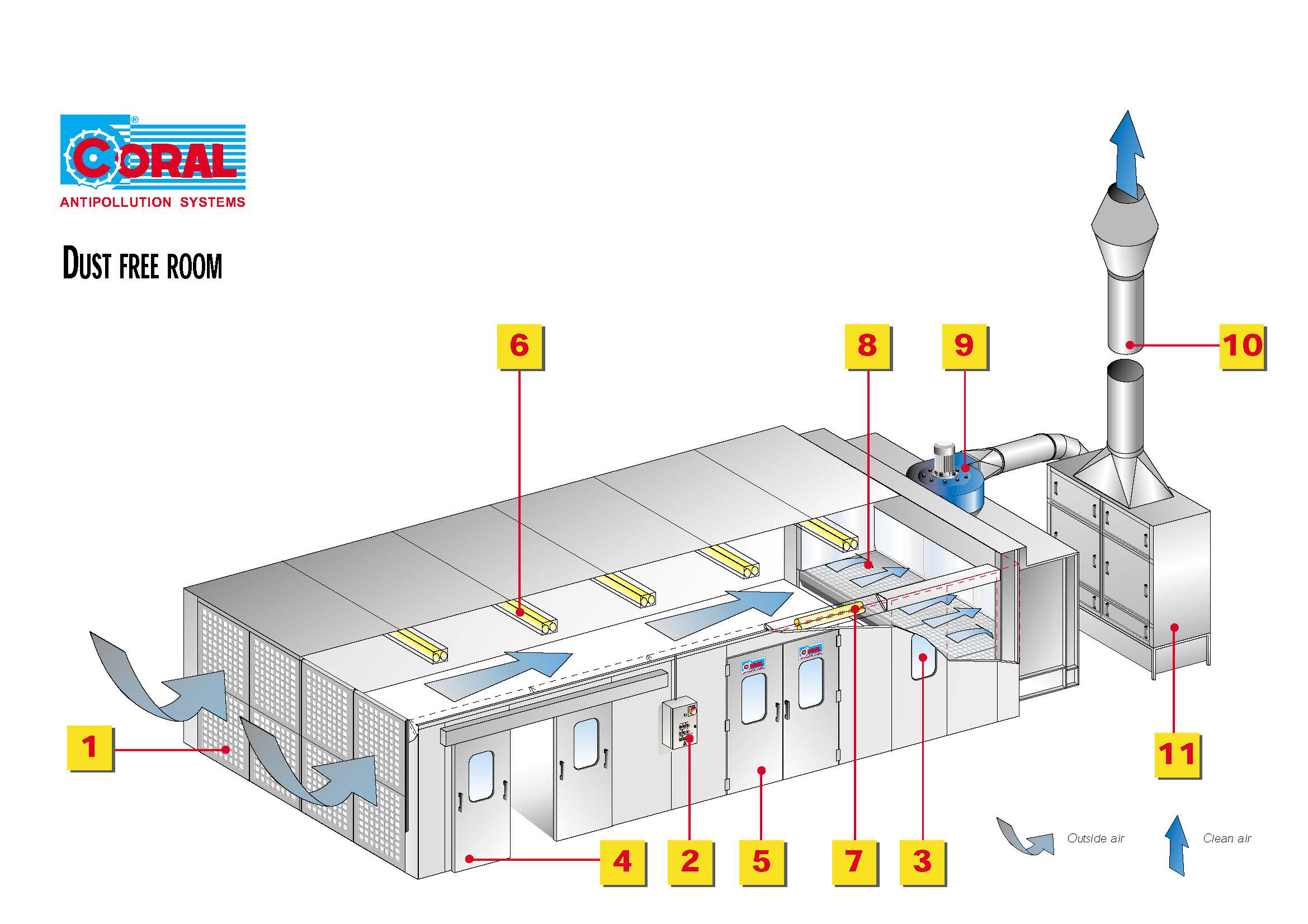 Dry painting booths. Valid for the same application as the Tecnodry; it has double filtering as per standard even with lower use of power thanks to the fan fitted with high-efficiency backward inclined spark-proof impellers, it can optimise extraction. Available also with extended walls and roof (version B), it is realised with two heights. Eurodry CA: the same characteristics as Eurodry are valid; it is the version with the additional activated carbon filtering stage with prefilter.