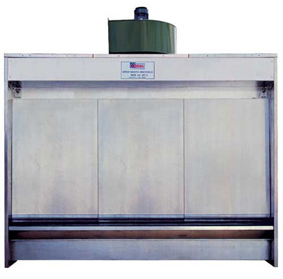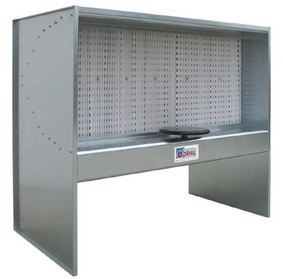 Dry painting booths. Suitable for painting small pieces, small ranges or touch-ups. Built in two models (1 and 2 mt), with fan fitted with high-efficiency backward inclined spark-proof impellers and rotary piece-holder. Supplied as per standard with paper filter: further filtering stage in glass fibre available on request.