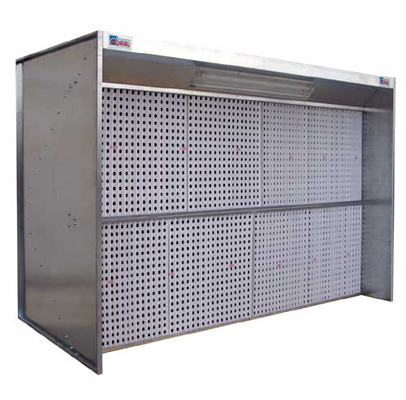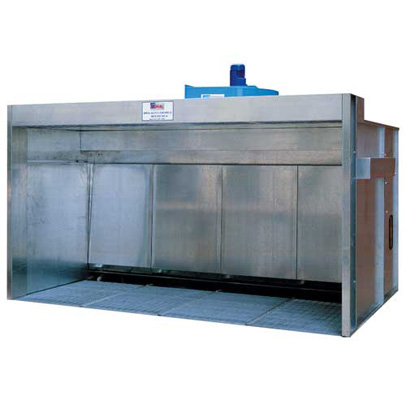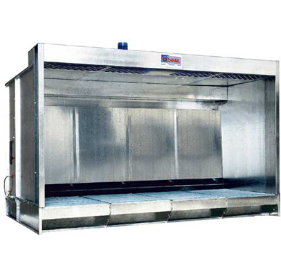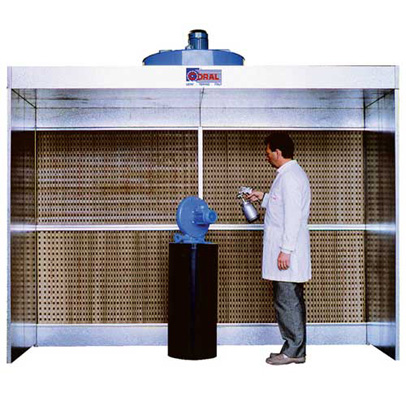 Dry painting booths. Suitable for continuous painting of large pieces, with fan fitted with high-efficiency backward inclined spark-proof impellers. Available also with extended walls and roof (version B), which optimise the capturing speed at the distance of 1 mt from the extractor. Supplied as per standard with bulbs and paper filter: further filtering stage in glass fibre available on request.