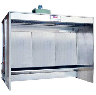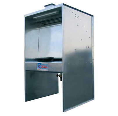 Water veil paint spray booths. The same as the Minidry range, the type of fans used and applications; they have a double veil of water plus two-stage dry filter and have rotary piece holder.