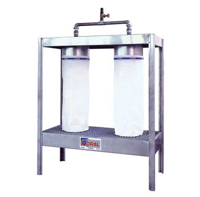 "Separator filter for waste water slurry deriving from painting jobs. Via the electric pump with open impeller positioned in the painting booth water collection tank, the waters saturated with slurry and large suspended particles are extracted and are conveyed through piping to the bag holder tank. The dirty waters begin to flow through the two filtering bags, which allow to withhold the sludge, allowing the clear waters to escape and fall into the underlying tank of the separator. By falling from here, the water cleaned from slurry returns into the painting booth collection tanks. The mist eliminator is fitted with an overflow float, which blocks the pump of the slurry collection bags are filled."